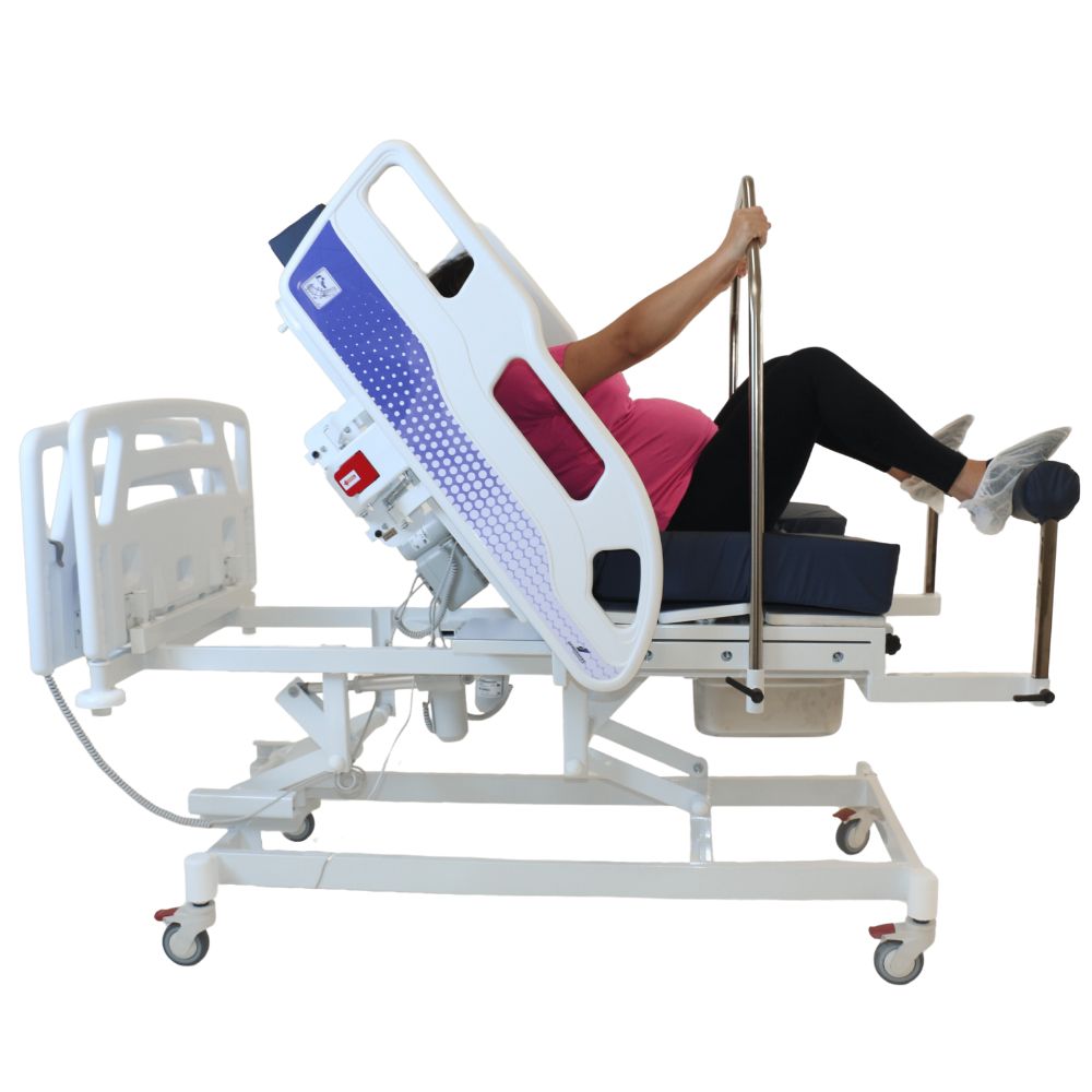 Arco de esforço removível, apoios de coxas ajustáveis e braços de esforço rebatíveis para suporte durante o parto humanizado.